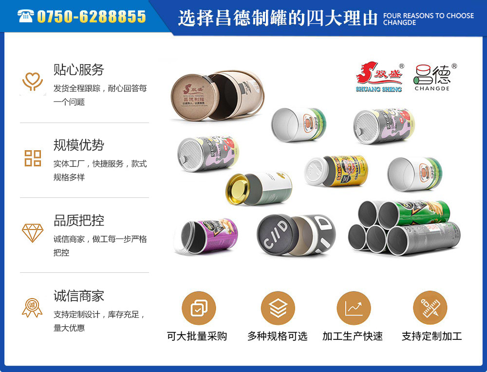 江門(mén)市昌德五金制罐有限公司位于江門(mén)與珠海臨近的古井鎮(zhèn),是專(zhuān)業(yè)生產(chǎn)紙罐,食品紙罐系列的包裝研制、開(kāi)發(fā)、生產(chǎn)的廠(chǎng)家,從建廠(chǎng)至今,公司本著“重合同、守信用”的原則,以“質(zhì)量求生存,客戶(hù)至上”為經(jīng)營(yíng)宗旨,贏得了很好的信譽(yù),公司擁有國(guó)內(nèi)一流的技術(shù)設(shè)備和多年的生產(chǎn)經(jīng)驗(yàn)。年產(chǎn)休閑食品紙筒500萬(wàn)左右,紙筒2000萬(wàn)支左右,易拉罐,食品罐等1000萬(wàn)左右,產(chǎn)品銷(xiāo)往各地。我廠(chǎng)是以高科技為先導(dǎo),以技術(shù)創(chuàng)新整合為手段,成為迅速崛起的專(zhuān)業(yè)性包裝企業(yè),憑借艱苦的創(chuàng)業(yè)精神和集體智慧,采用規(guī)范的現(xiàn)代企業(yè)運(yùn)行機(jī)制,形成具有鮮明特色的企業(yè)文化模式和管理...